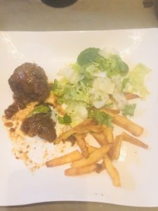 Servir les boulettes avec des frites maison cuites à la Belge (c’est à dire 2 fois!) et une salade du jardin! Un vrai régal!!